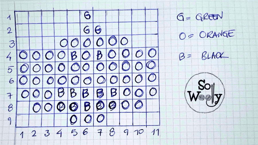If you’d like to follow this graphic, take into account that you’ll need 11 stitches and 9 rows to get the motif centered.